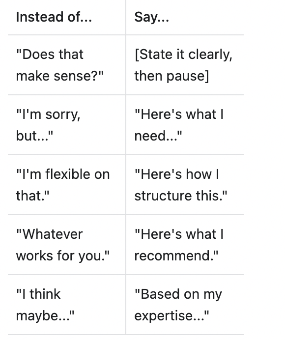 Every "Does that make sense?" invites them to doubt you. Every "I'm sorry, but..." undermines your authority before you even state your position.